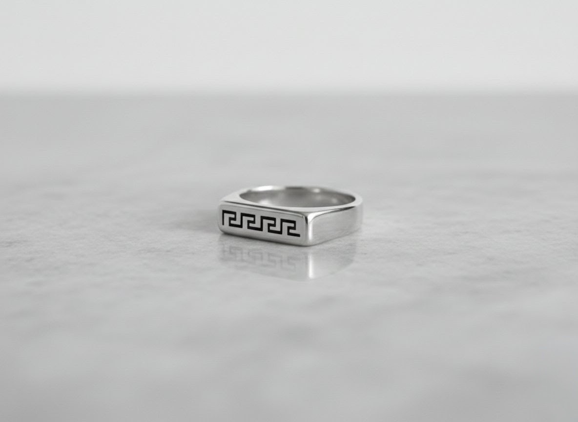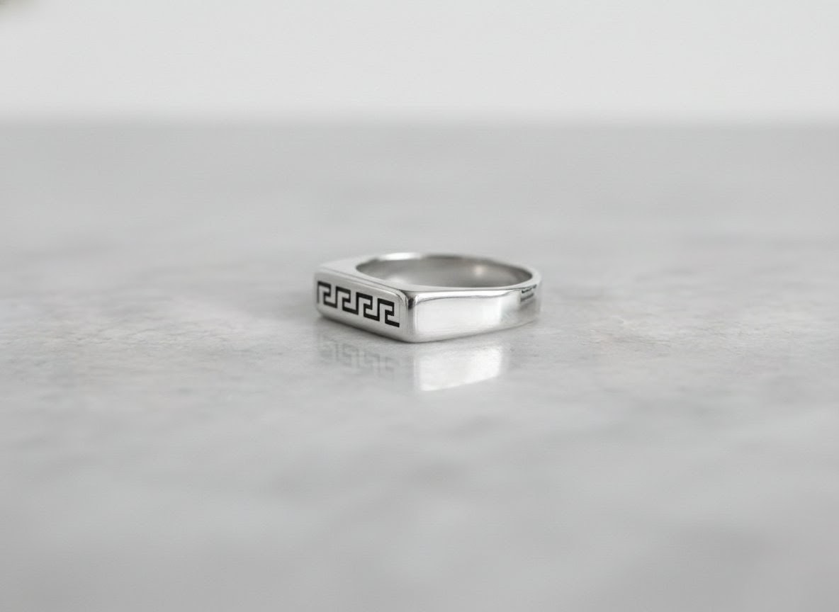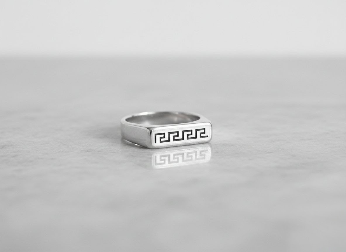 Men’s Greek Key Signet Ring - Stainless Steel Silver Band with Engraved Meander DesignMen’s Greek Key Signet Ring – Stainless Steel Silver Band with Engraved Meander Design